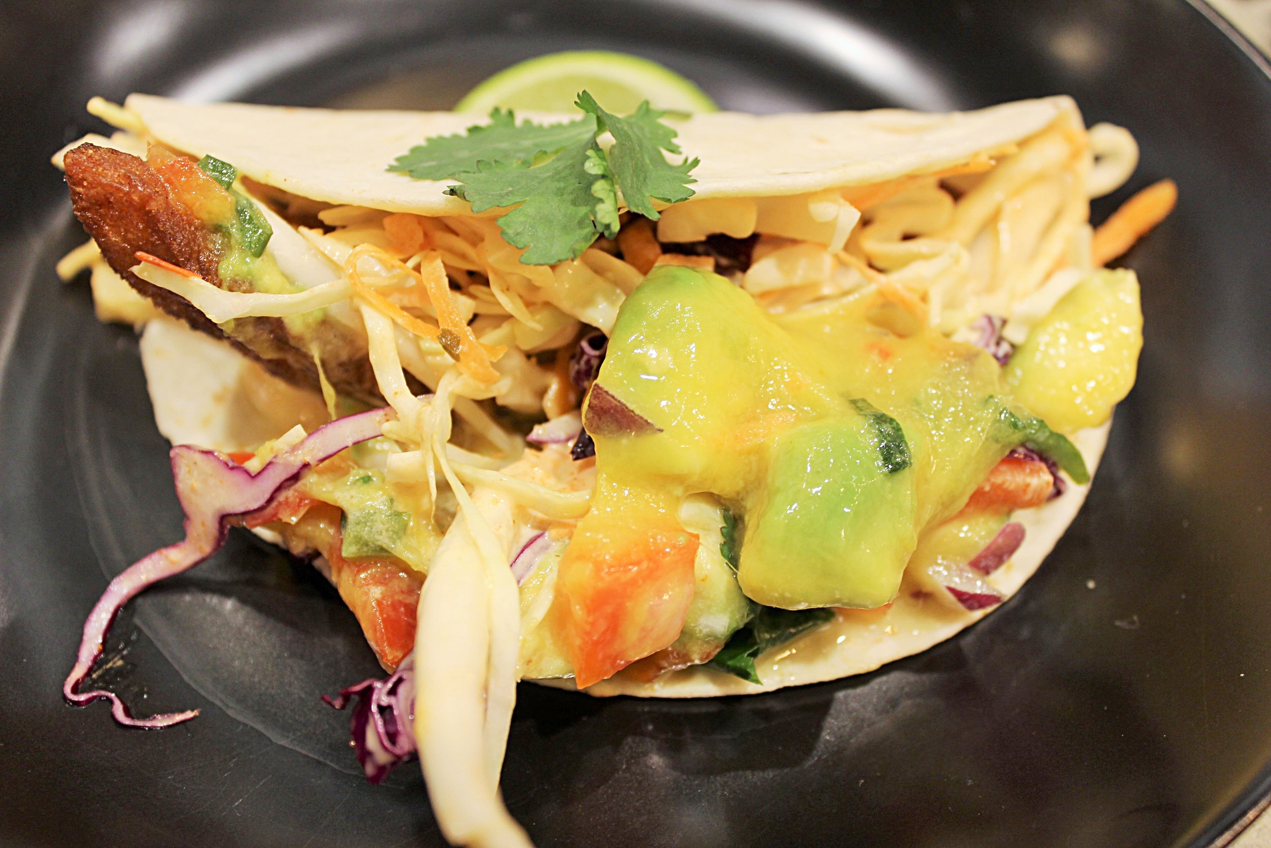 The delish fish taco - lightly beer-battered flathead, chipotle aioli, chipotle coleslaw, mango avocado salsa and fresh coriander.