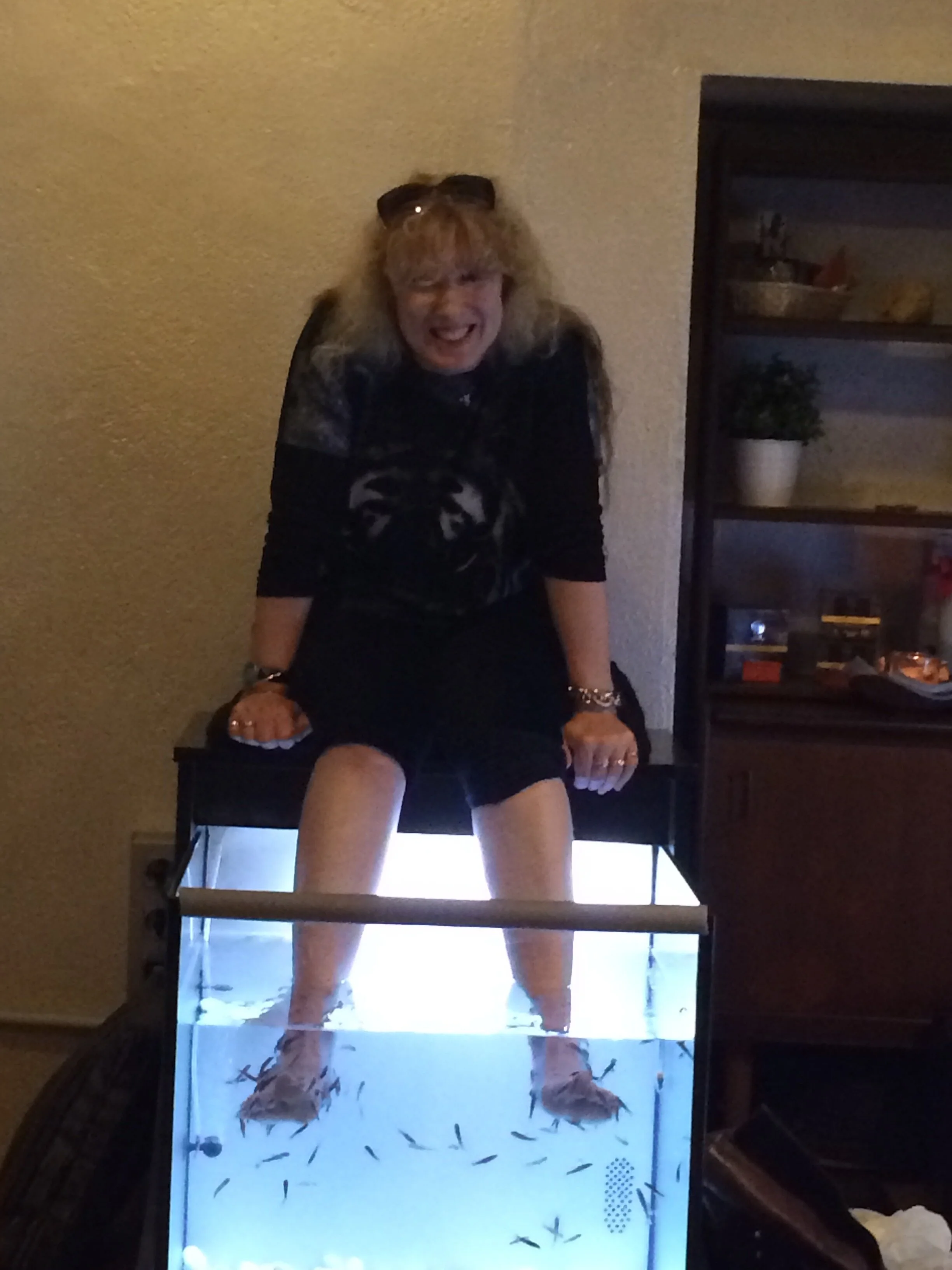 We’ve eaten plenty of fish but this time it was their turn for revenge! We’d seen fish pedicures before but mostly on TV. Well here was one right in front of us. It was time to bite the bullet, hot foot it in there, toe the line or flesh it out! Mlady was to be the tester here.