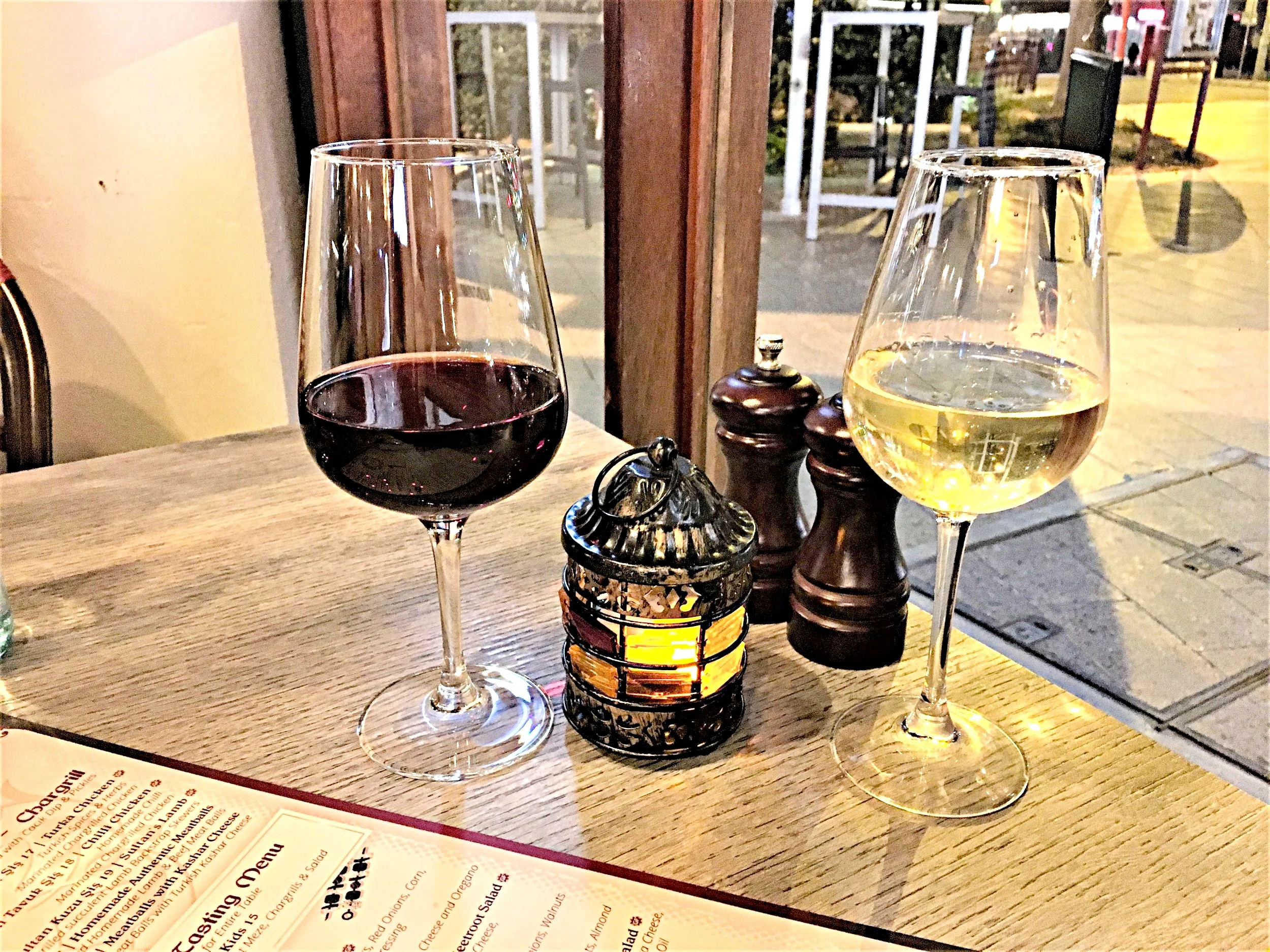 The menu offers homemade dips and starters, hot and cold meze items, char-grilled meats and a range of salads. It all sounds so delicious we opt for the Chef’s Selection Tasting menu, which has a bit of everything. A nice glass of Turkish white and red wine starts us on our culinary journey.